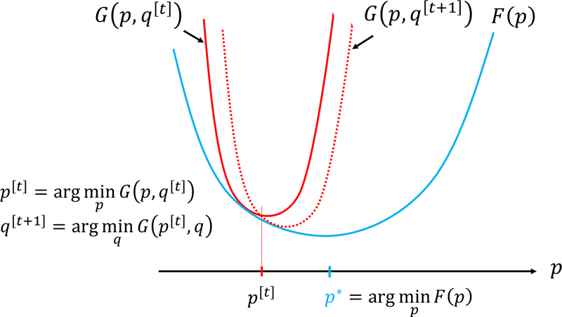 情報理論における様々な符号化問題の限界を表現する量は,多くの場合最適化問題の解の形で表現されます.有本ブラハットアルゴリズムは,離散無記憶通信路の通信路容量と離散無記憶情報源のレート歪み関数を達成する確率分布を求める反復アルゴリズムであり,最適値への収束が保証されています.最近の情報理論の限界を表現する量も計算アルゴリズムを必要としています.我々は,そのような最新の有本ブラハットアルゴリズムの拡張を研究しています.