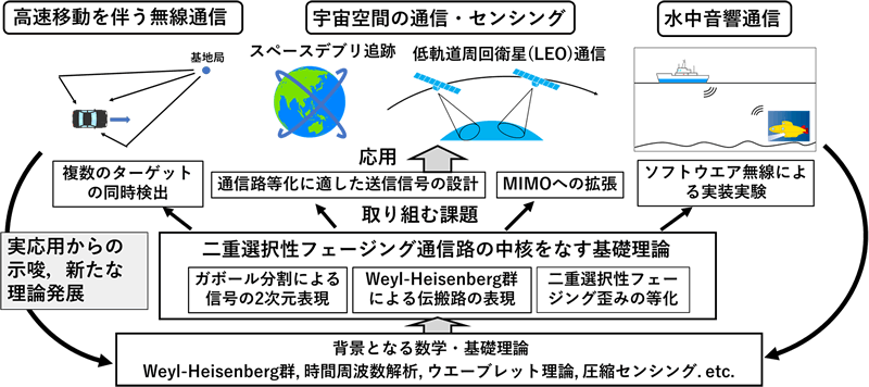 高速移動する自動車,低軌道衛星との通信,水中音響通信など大きなドップラー周波数推移を伴うような通信で,信頼性の高い情報通信を実現することを目的として,私たちの研究室では,ガボール分割多重通信を研究しています.この通信方式は時分割と周波数分割を同時に行う我々のグループの独自の方式であり,ドップラーシフト量を推定し補正することが出来ます.