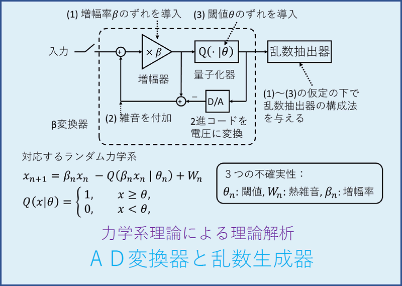 私の研究室では \(\beta\) 写像 \(f_{\beta, \theta}(x) = \beta x\) (if \( 0 \le x \le \theta\) ), \(B(x) = \beta x-1 \) ( if \( \theta < x \le 1\) ) ( \( \theta \) はある閾値)を用いたAD変換器の性質と乱数生成器としての応用を研究しています。